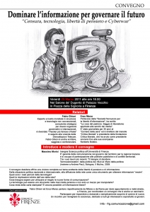 “Censura, tecnologia, libertà di pensiero e Cyberwar”. relatori:fabio ghioni ed enzo marzo; modera massimo morisi. Il convegno desidera offrire una visione completa sul tema scottante della libertà di pensiero e di informazione. Dalla situazione politica nazionale e internazionale, alla diffusione della rete come unico strumento per ottenere informazioni “neutre”. Quali sono i reali pericoli della tecnologia? Quali le implicazioni etiche dell’uso della rete? Cosa bisogna sapere per utilizzare al meglio le nuove forme di comunicazione?