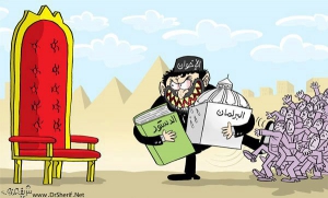 p.s: Nella vignetta si vede un omone, che rappresenta i Fratelli Musulmani, correre verso la poltrona della Presidenza, con in mano la Costituzione e il Parlamento.