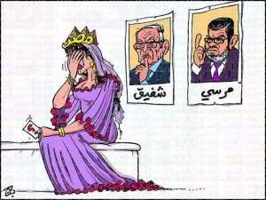 p.s: Nella vignetta, l'Egitto sconsolato è indeciso tra il votare per Morsy o per Shafiq.